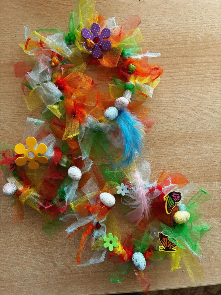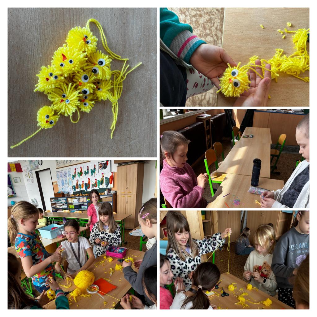 Vyráběli jsme jarní věnečky, které nám rozzářily družinu i náladu. Povídali jsme si o velikonočních tradicích, tvořili roztomilá kuřátka z příze a zkoušeli jsme i netradiční pěstování – osení jsme zasadili do punčochy, a vznikly tak vtipné hlavičky skřítků s travnatými vlasy.